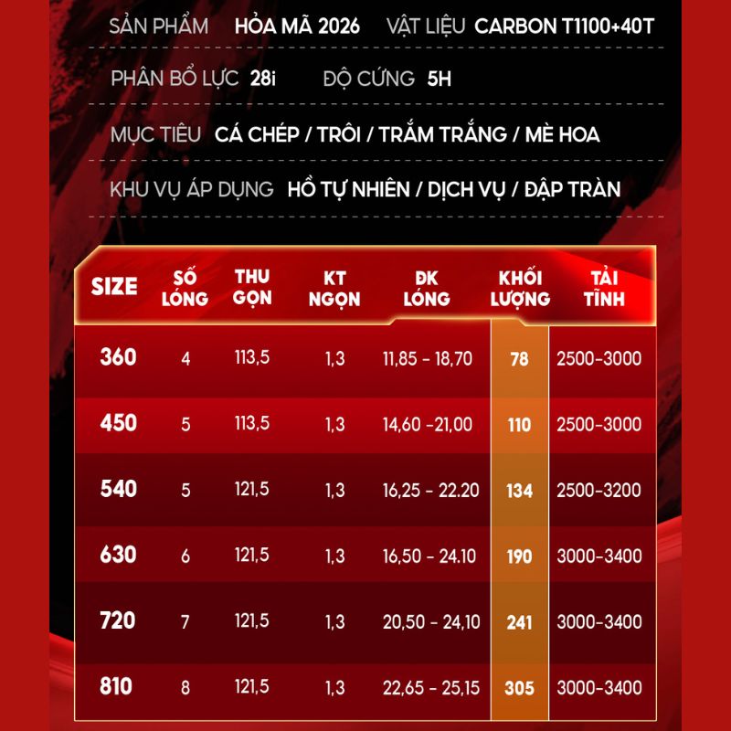 Nhờ cấu trúc carbon cao cấp cùng thiết kế tối ưu lực, Hoả Mã CC-48 có khả năng tải cá lớn, có thể xử lý các dòng cá trên 10kg. Điều này giúp cần thủ tự tin hơn khi đối đầu với những con cá chép lớn mà vẫn hạn chế tối đa nguy cơ gãy cần.