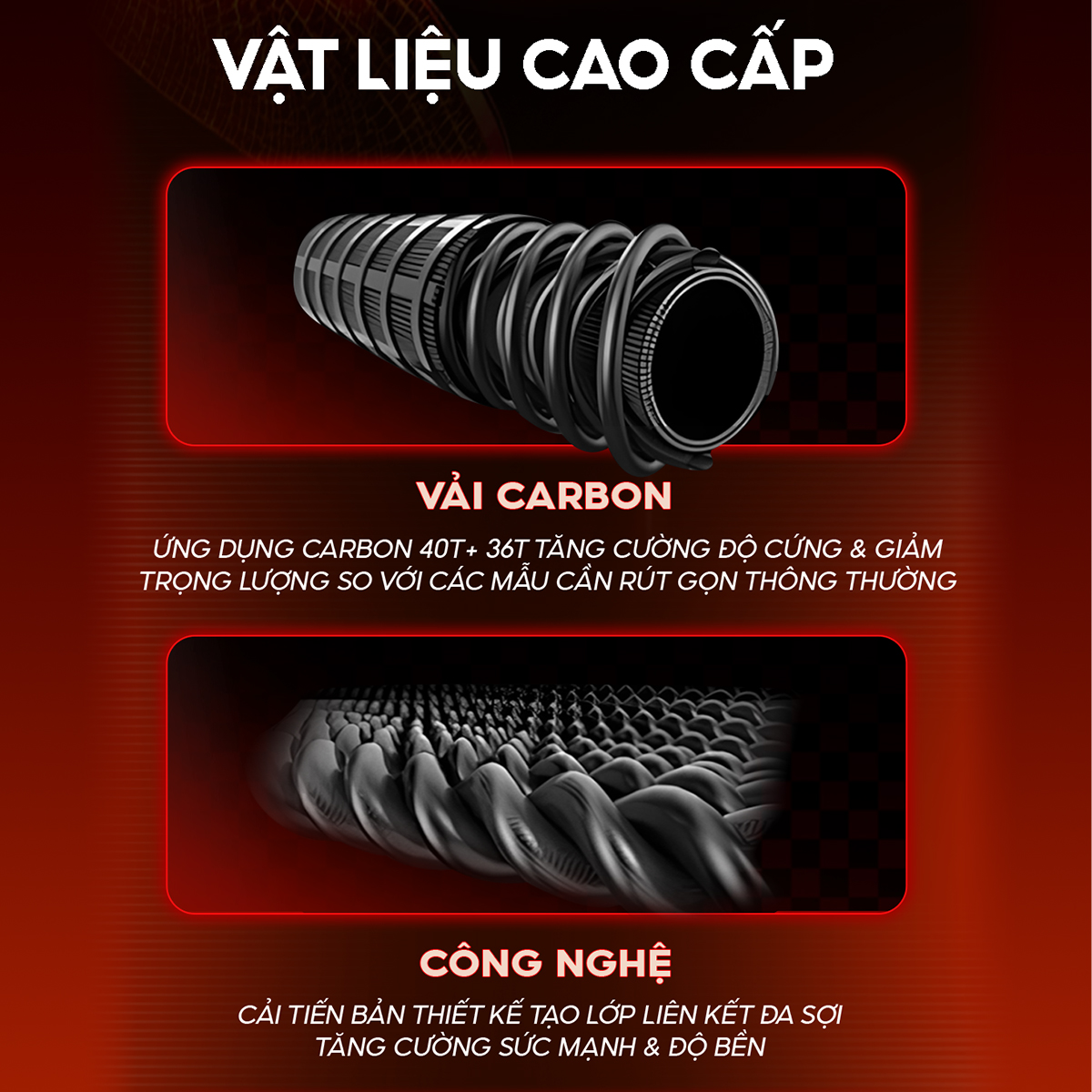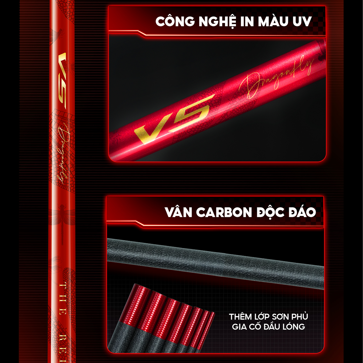CC-46 được chế tạo từ vải carbon 36T + 40T, kết hợp công nghệ đa sợi tiên tiến giúp tăng độ bền và khả năng chịu lực vượt trội. Lớp sơn in màu UV hiện đại không chỉ tạo hiệu ứng ánh sáng bắt mắt mà còn giúp chống phai màu, chống trầy xước cực tốt, giữ cho cần luôn mới dù sử dụng trong điều kiện khắc nghiệt.