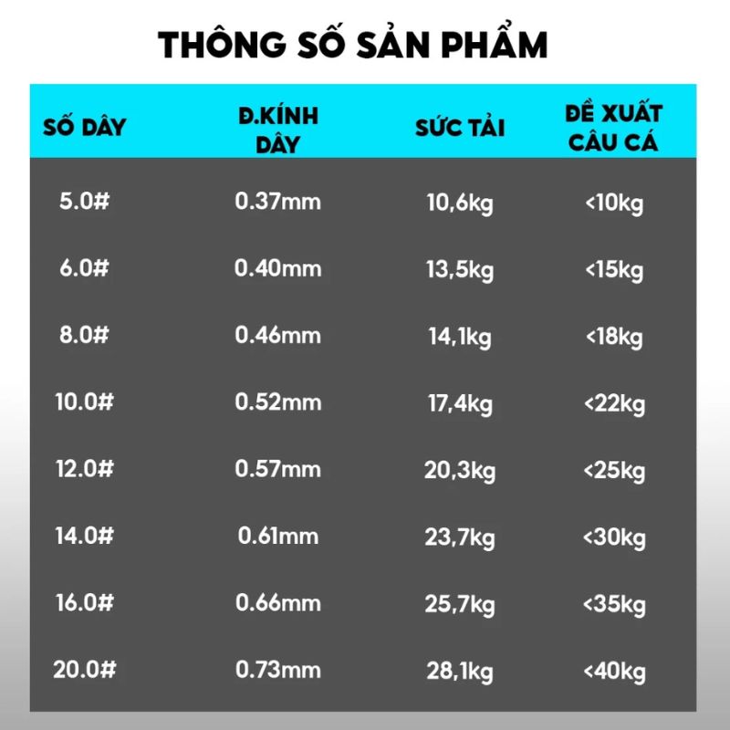 Tùy theo mục đích câu cá và loại cá mục tiêu, người dùng có thể chọn size dây và chiều dài phù hợp để tối ưu hiệu quả sử dụng.