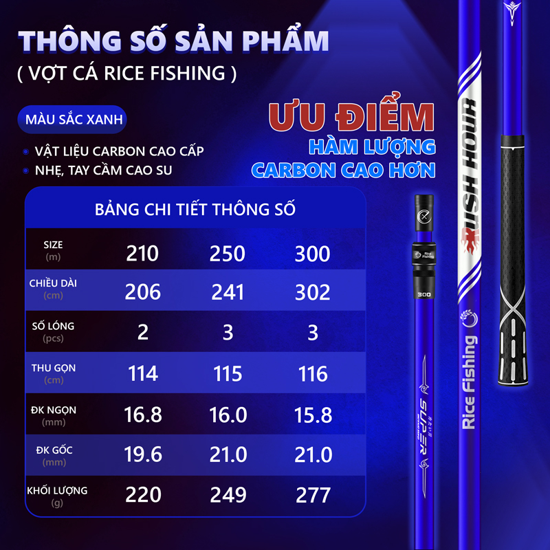Mẫu cần được sản xuất bằng chất liệu cacbon vô cùng chắc chắn cùng thiết kế, màu sắc vô cùng thể thao. Chất liệu này chính là chất liệu được sử dụng nhiều nhất để sản xuất cần câu chất lượng trên thị trường hiện nay. Sản phẩm thuộc thương hiệu Rice Fishing cực kỳ uy tín, đảm bảo chất lượng từng chi tiết cho các cần thủ.
