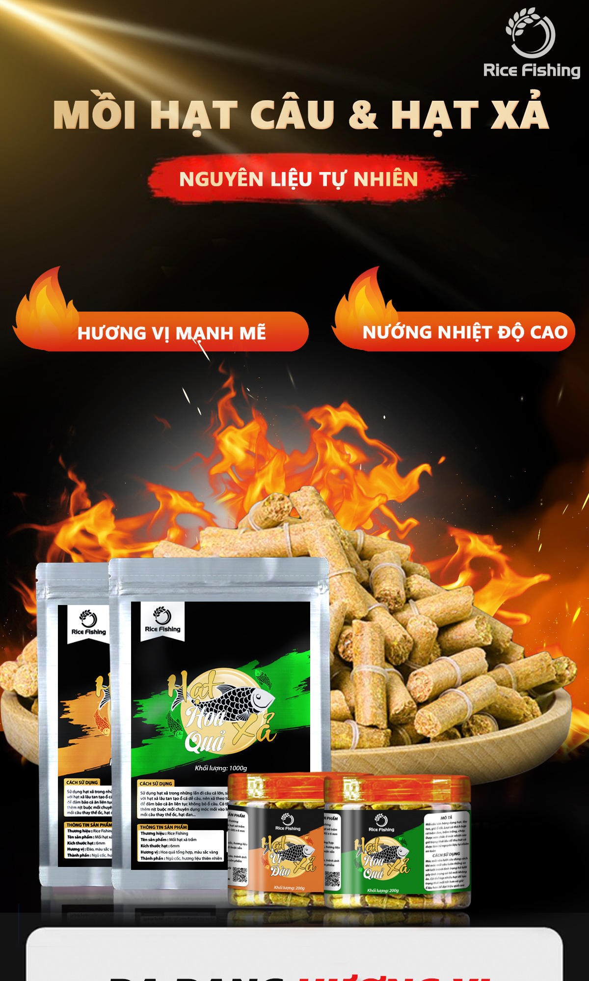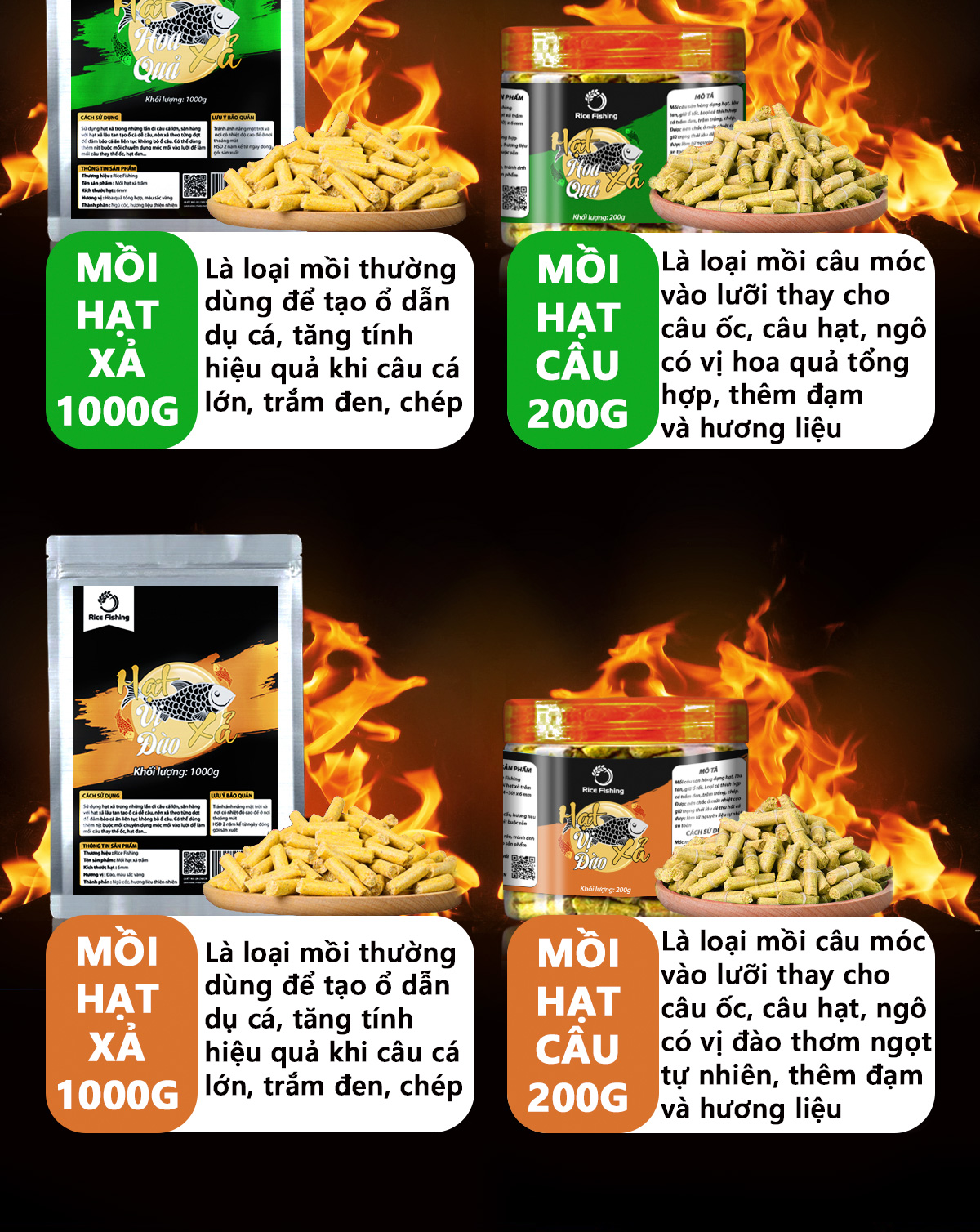 Nhằm cung cấp mồi câu cá hạt xả tạo ổ , cũng như hạt câu cá tiện lợi , Rice Fishing đã sản xuất và ra mắt 2 mẫu hạt: