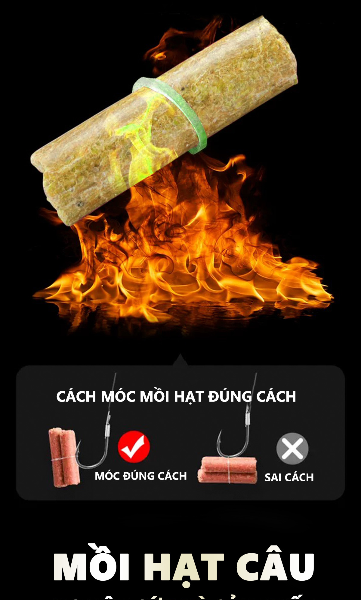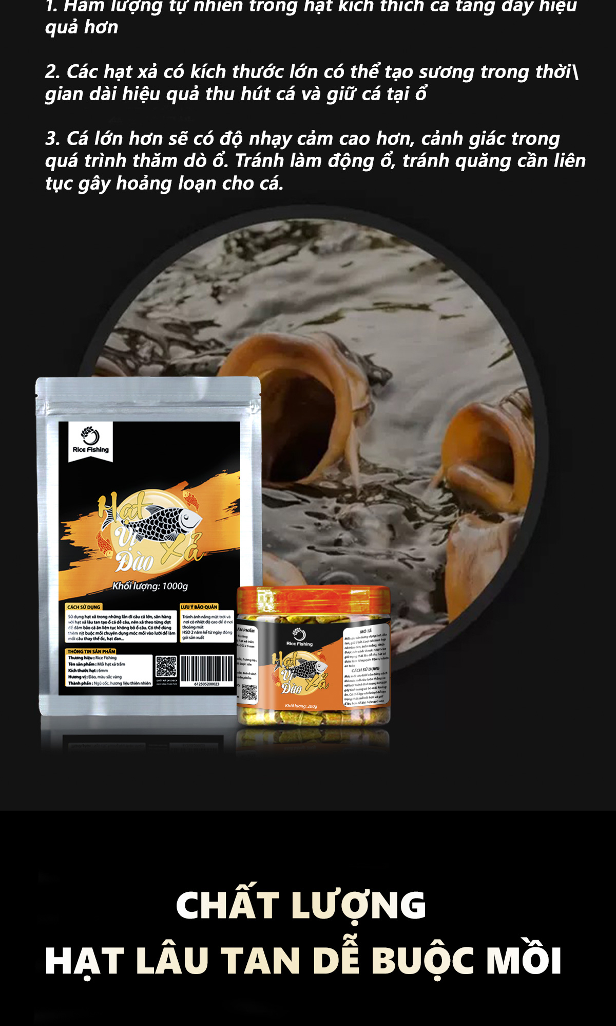 - Hạt câu trắm chép thì được sản xuất với nguyên liệu hấp dẫn , kèm theo hương vị bí quyết của nhà Rice Fishing , Hạt câu sẽ ngon hơn hạt xả để nhằm thu hút và dẫn dụ cá , khiến cá cắn câu tăng tỉ lệ săn cá .
