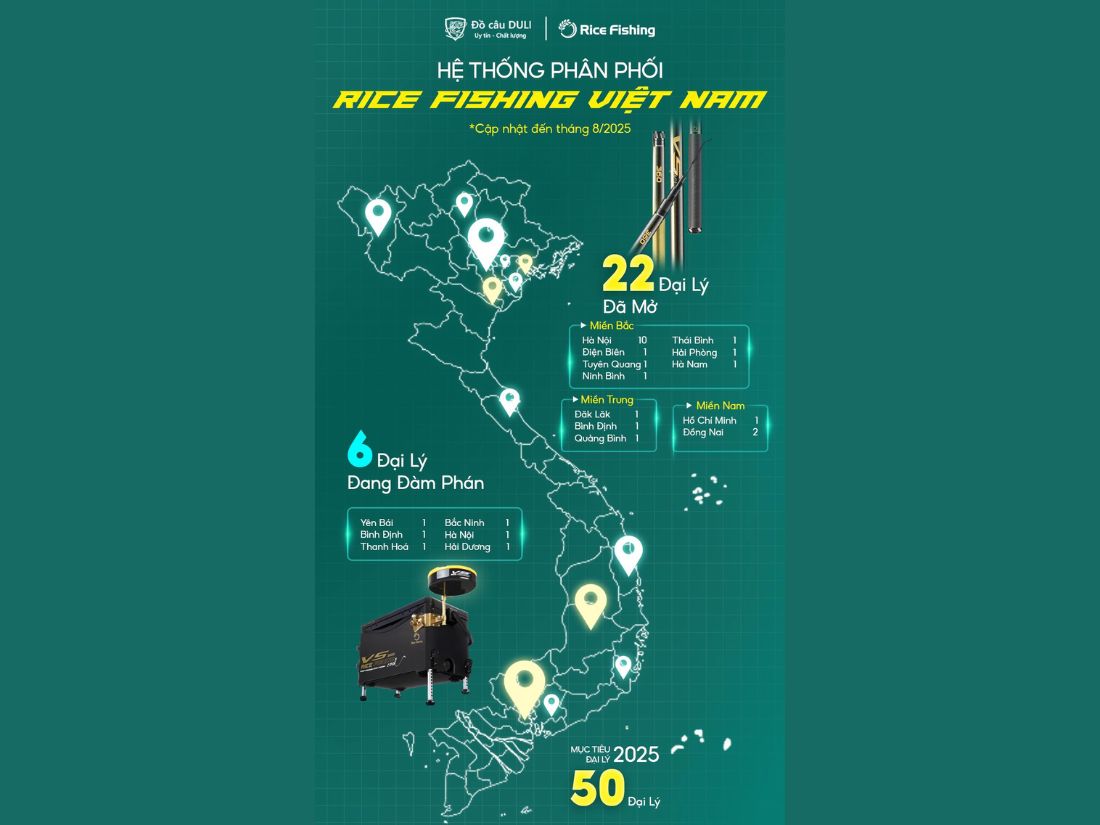 Hệ thống đại lý Rice Fishing hướng tới mục tiêu phủ sóng toàn quốc, tạo điều kiện để bất kỳ cần thủ nào, ở bất cứ tỉnh thành nào cũng có thể tiếp cận sản phẩm chính hãng. Từ thành phố lớn cho tới các khu vực ngoại ô, đại lý đều đóng vai trò là điểm kết nối giữa thương hiệu và cộng đồng câu cá.