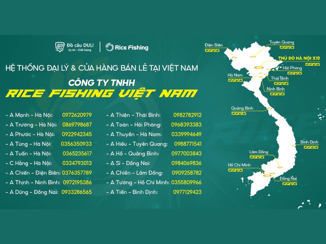 Hệ thống đại lý Rice Fishing không chỉ mang đến sản phẩm chất lượng mà còn khẳng định uy tín trong lòng người yêu câu cá. Với sự đồng hành của Đồ câu Duli, khách hàng sẽ nhận được nhiều chính sách ưu đãi và dịch vụ hỗ trợ tận tâm. Nếu bạn quan tâm và muốn hợp tác, hãy liên hệ ngay để được tư vấn chi tiết và nhanh chóng.