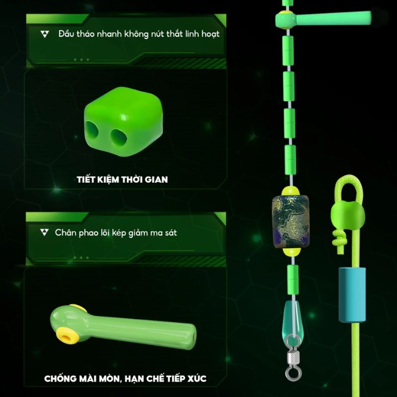 Chân phao dạng lưỡi kép giúp giảm ma sát tối đa, mang lại độ nhạy cao trong từng cú chạm cá. Các chi tiết được gia công tròn mép, không sắc nhọn, đảm bảo an toàn tuyệt đối khi thao tác. Hơn hết, thiết kế hộp nhỏ gọn giúp bạn dễ dàng mang theo bên người – dù là buổi câu thư giãn hay những trận săn hàng dài ngày.