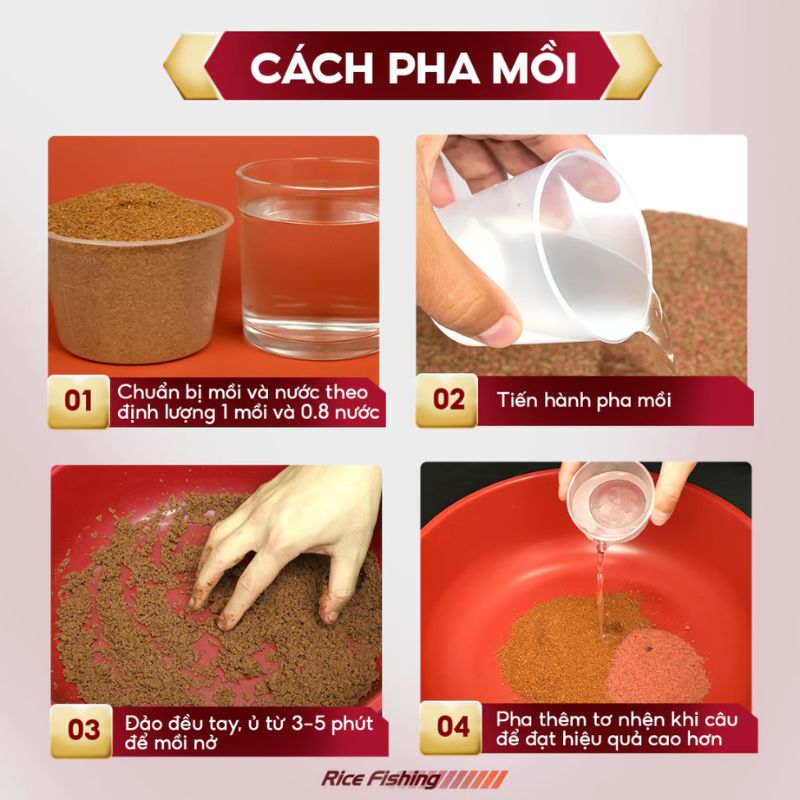 - Bước 3: Đảo đều bằng tay, sau đó ủ từ 3–5 phút để mồi nở đều và ngấm nước