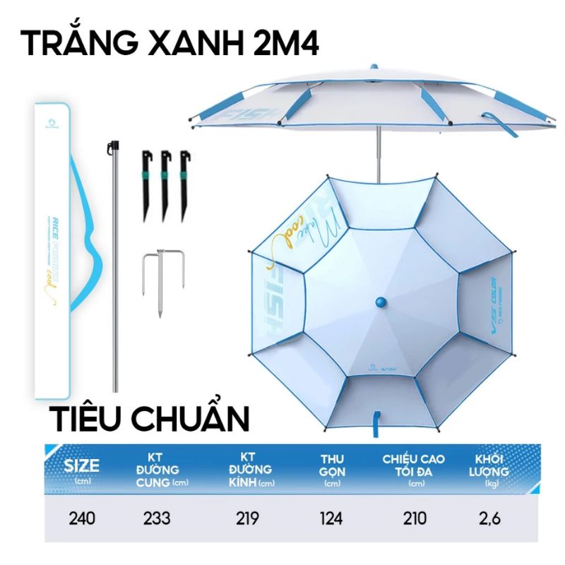 Với phiên bản trắng xanh, ô V5 KK-64 khoác lên mình vẻ ngoài khỏe khoắn, năng động, rất phù hợp với những cần thủ thích dịch chuyển, yêu phong cách trẻ trung. Dù bạn câu sông, câu hồ hay câu đài – màu sắc này vẫn luôn “ăn ảnh” và dễ phối cùng trang phục ngoài trời.