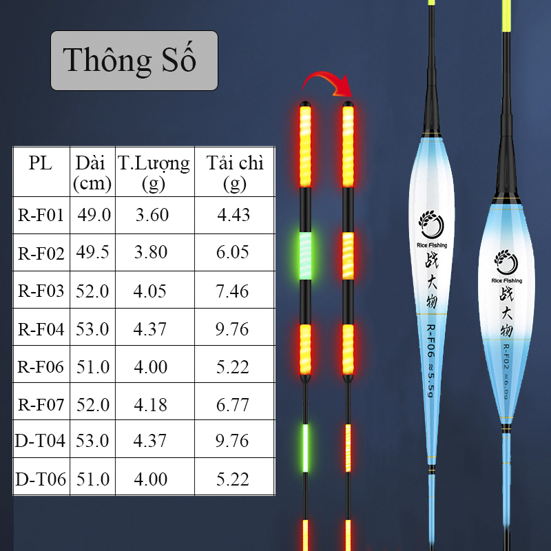 Rice Fishing hiểu được sự đa dạng về nhu cầu của các cần thủ, chính vì thế đã cho ra mắt mẫu phao câu đêm PC-29 với nhiều phân loại khác nhau. Mã phao R-F là mã phao điện câu đêm có thể đổi màu, thông số cụ thể như sau :