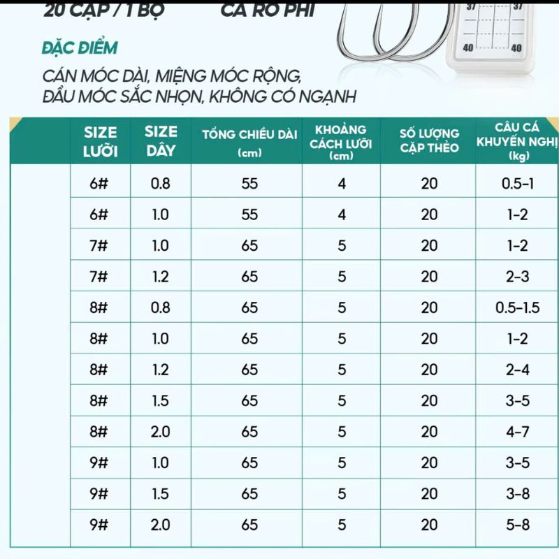 - Size lưỡi: từ số 6 đến số 9, phù hợp với các loại rô phi từ nhỏ đến trung bình – lớn.